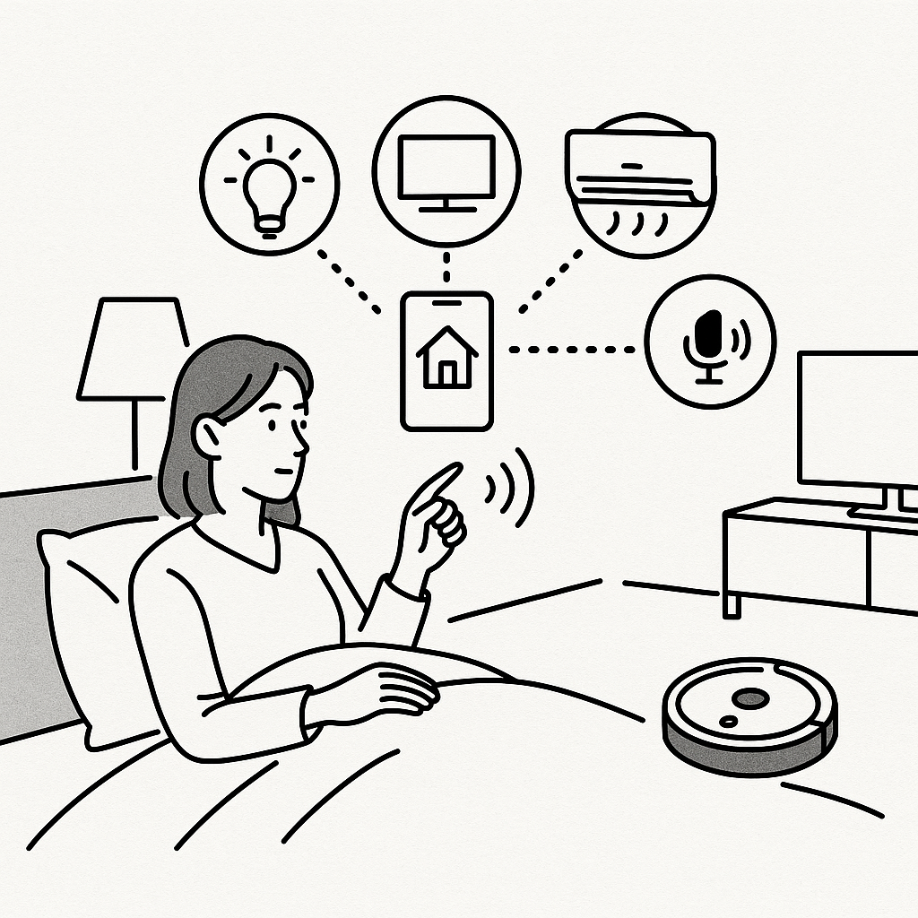 照明、テレビ、エアコン、スピーカー、ロボット掃除機などをIoTデバイスで接続し、音声操作が可能です。ベッドに寝たまま照明を操作するなど、住まいに新しい快適さをもたらします。