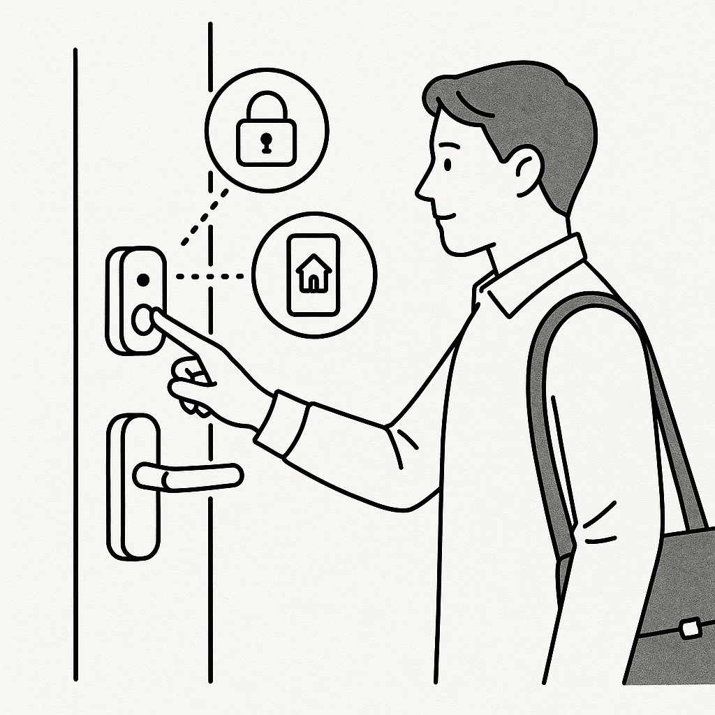 玄関ドアへのスマートロック導入で、鍵の持ち運びや紛失のリスクを減らし、ボタンやスマホで開閉できるようにしました。ドアが閉まると自動で施錠されるオートロック機能は、お子様がいる家庭や高齢者にとって安心・安全な機能です。