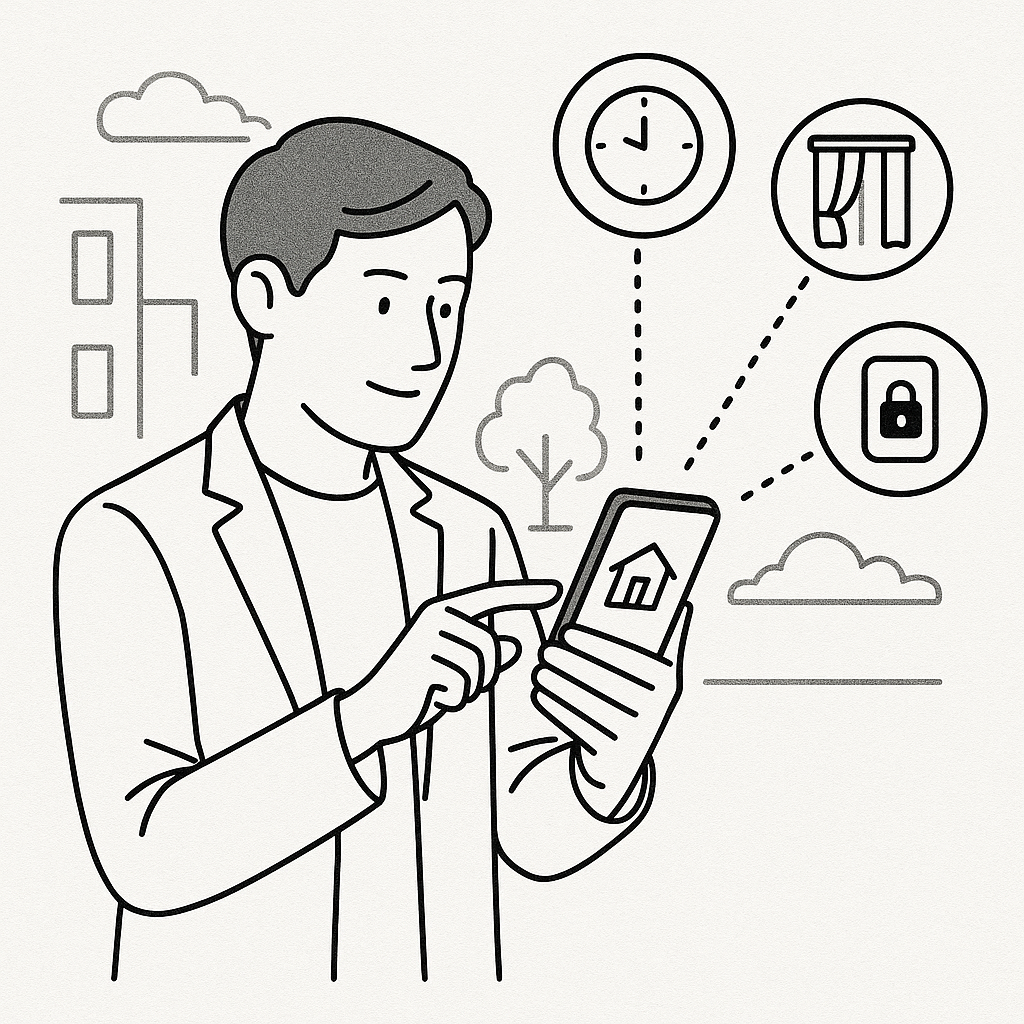 遠隔操作で、スマートフォンから外出先で玄関の施錠・解錠が可能です。さらに、タイマー設定によるカーテンや家電製品の自動制御、外出先からの戸締まり確認なども設置可能です。