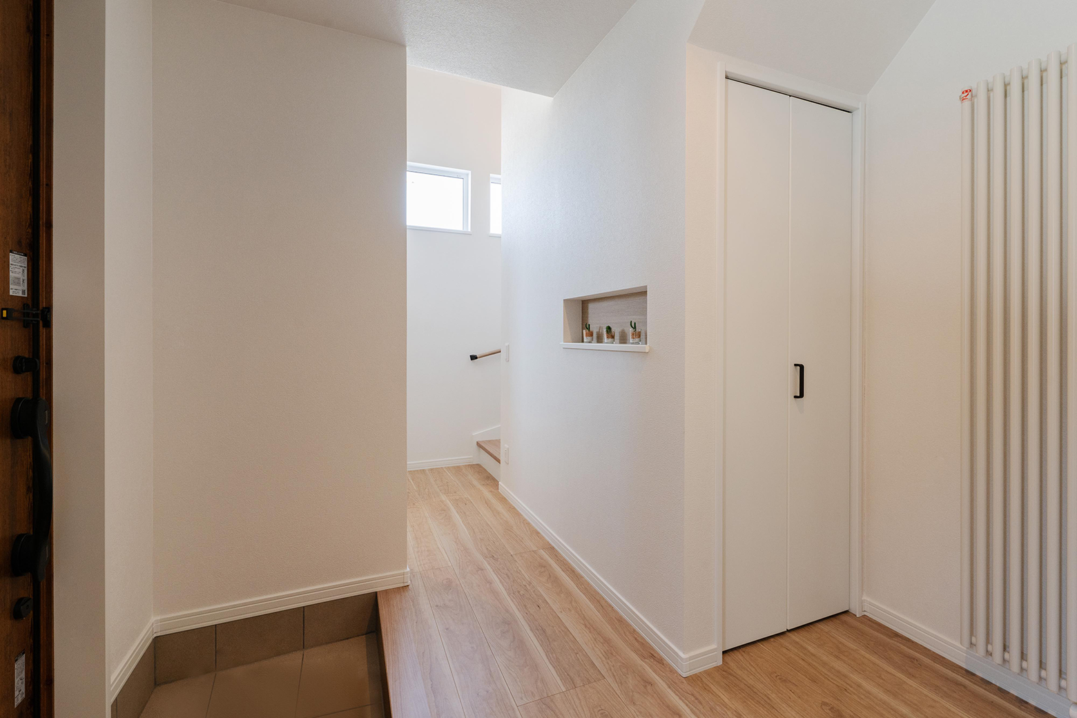 玄関に入ると、東からの明るい光が一日中玄関ホールを包み込み、暗さを感じることはありません。ゆとりのある空間は土間の間口も広く靴の脱ぎ履きもスムーズ。忙しい朝や帰宅時、大きな荷物を搬入するときも十分な広さがあるので家族みんながゆったりと行き来できる玄関です。