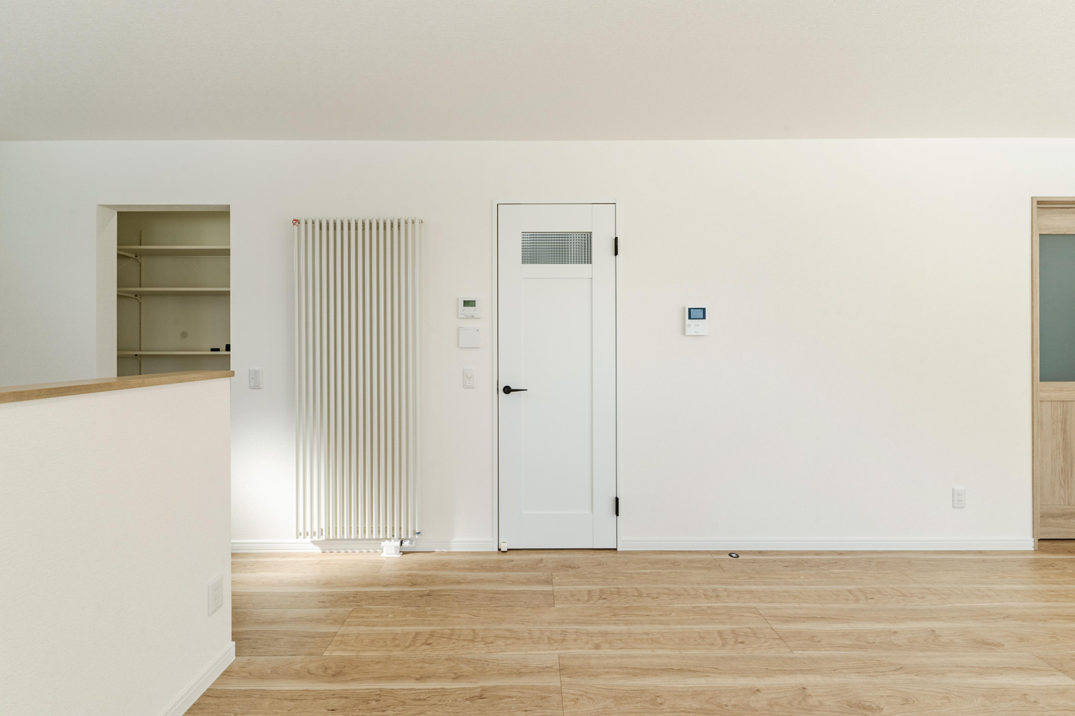 中央の白いドアは洗面所へ、右の木目のドアは玄関へ。