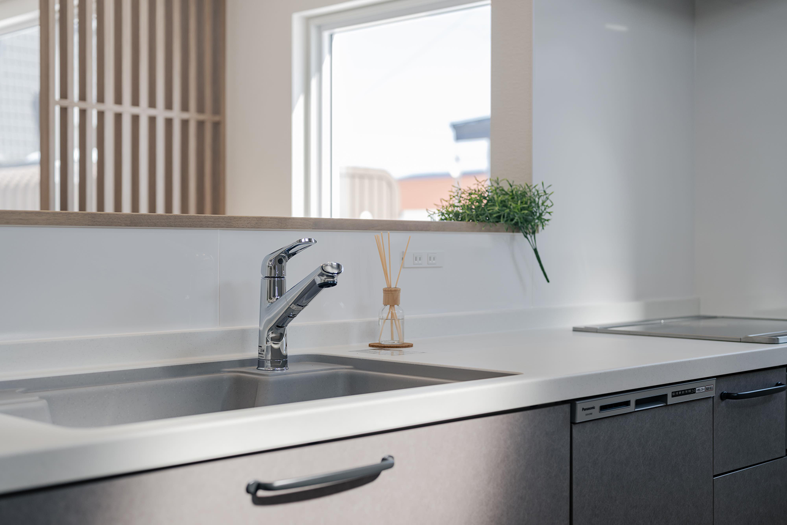 窓からの自然光が差し込む明るいキッチン。広々としたワークトップとシンプルなシンクまわりは、料理や片付けがしやすい設計です。食洗機やIHクッキングヒーターを備え、効率的で快適な家事をサポート。清潔感あふれる空間で、毎日の調理がより心地よい時間になります。